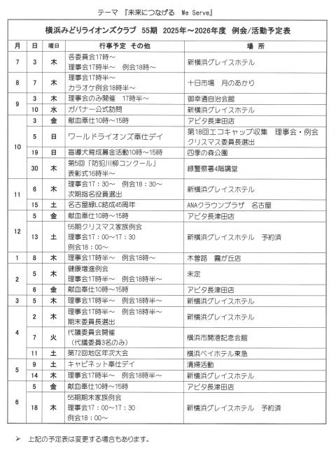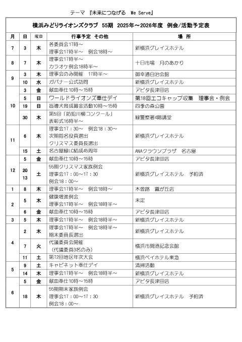 55期 2025年7月~2026年6月 年間 例会/活動 予定